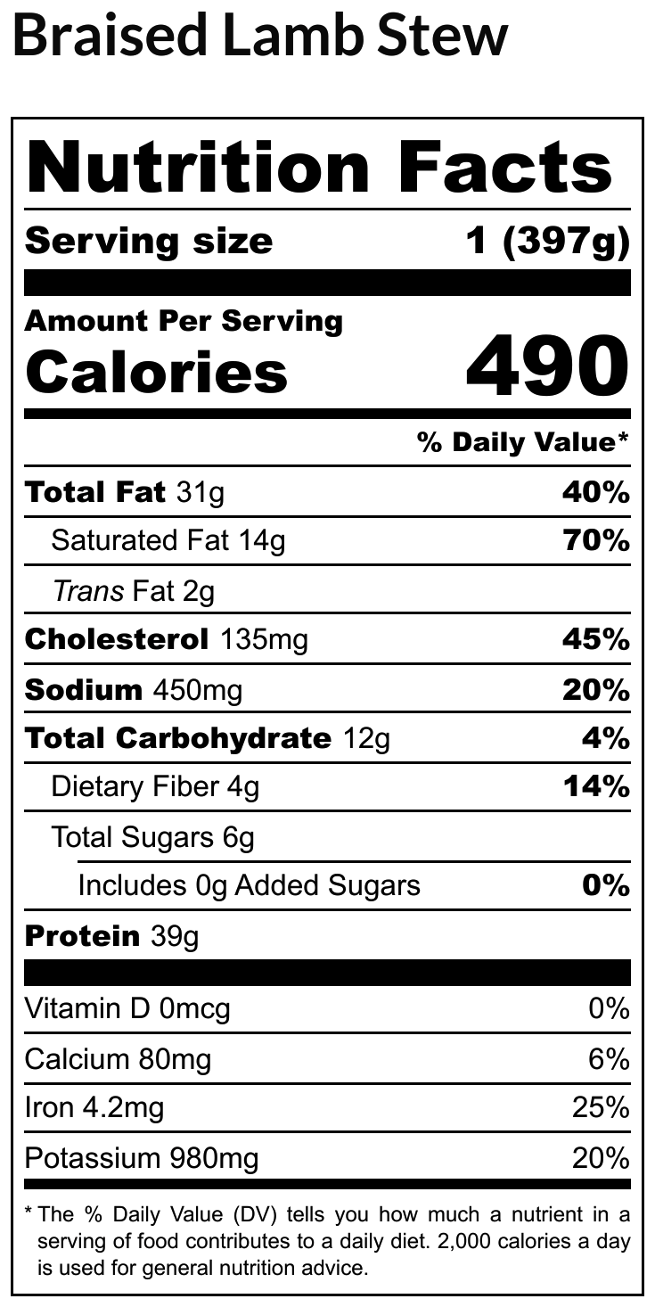 Indulge in the delectable flavors of our Braised Lamb Stew that comes with a medley of hearty vegetables like carrot, celery, onion, and cabbage. Savor the mirepoix base that adds depth of flavor to this delicious and wholesome dish for a truly savory experience. (It's lamb without the baa-d stuff!)