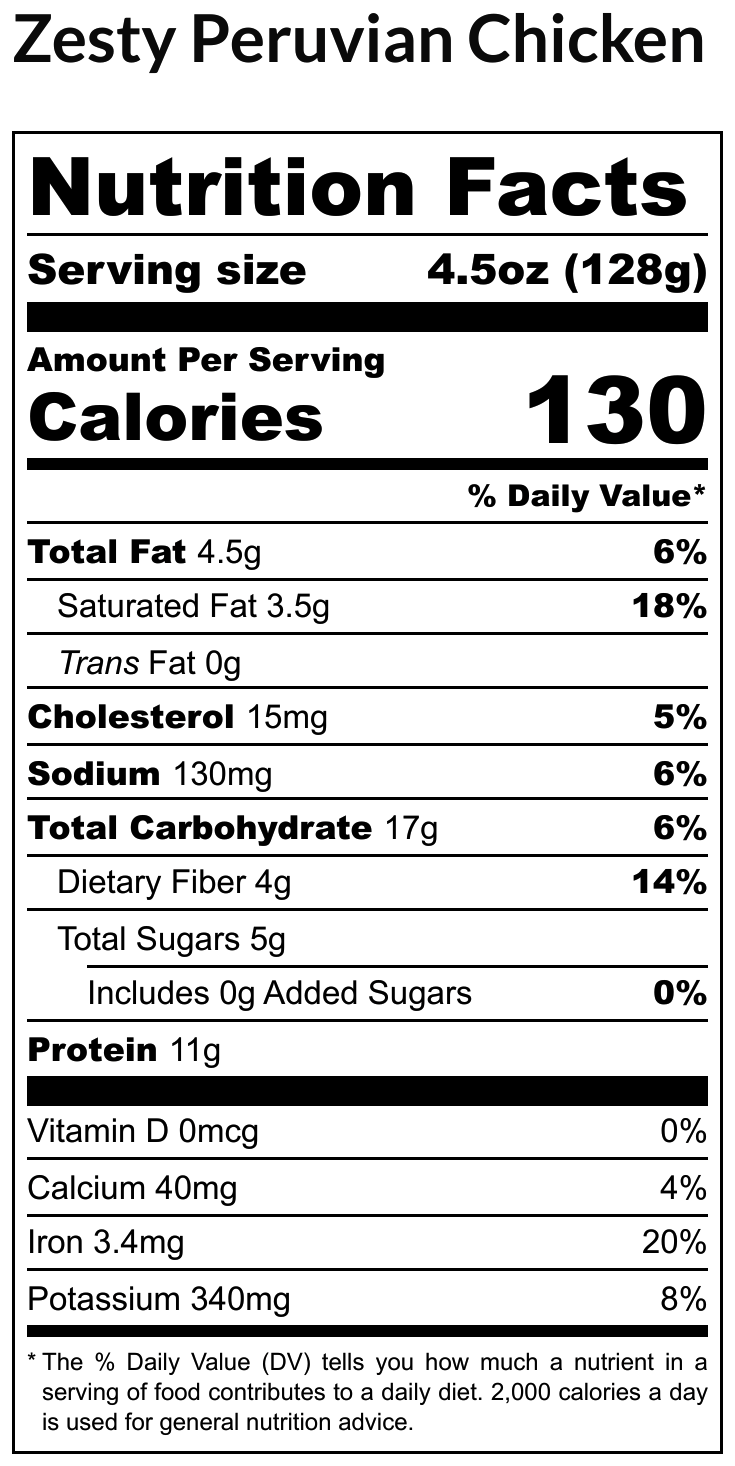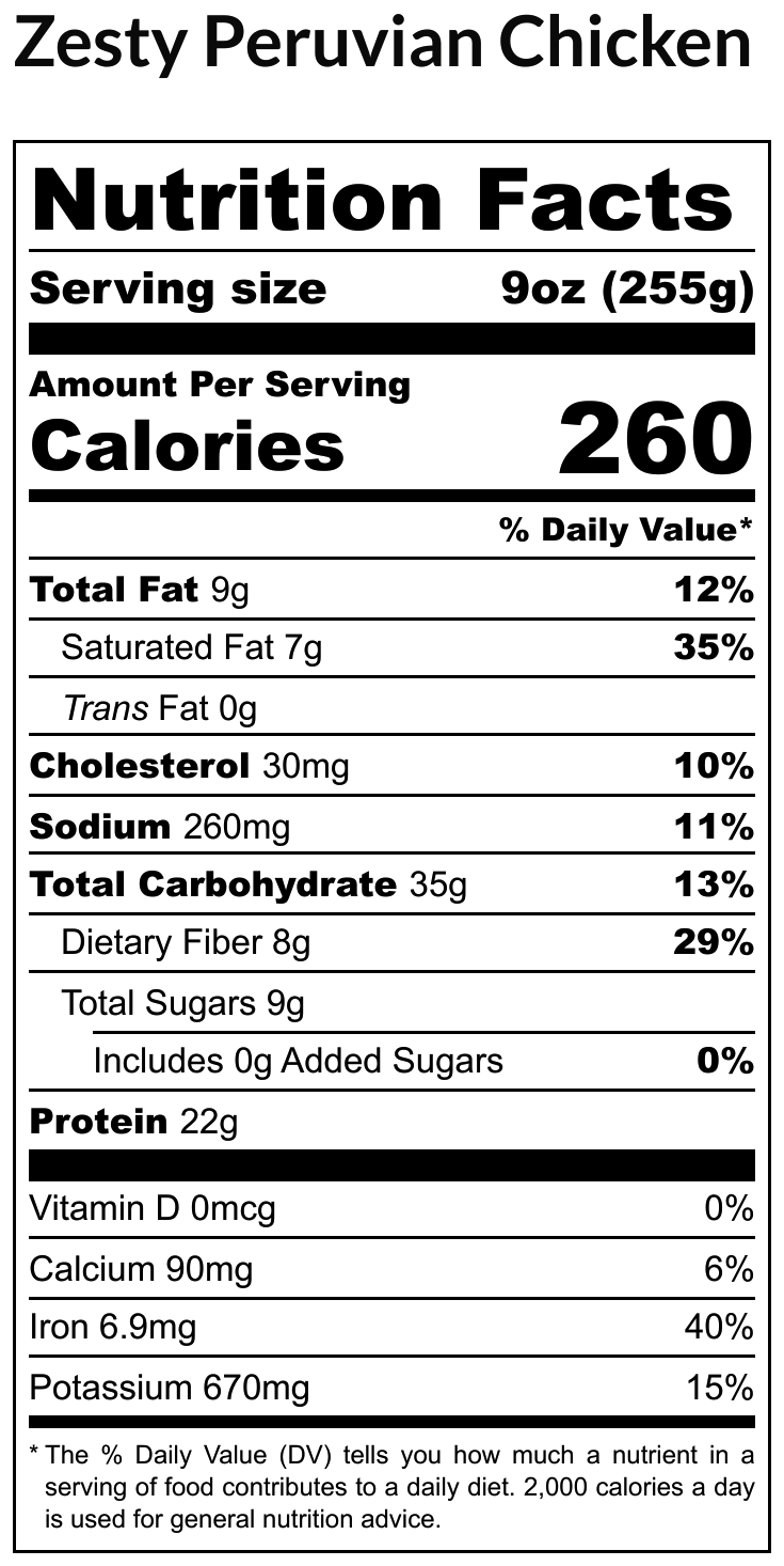 Our Zesty Peruvian Chicken is thoroughly seasoned with spices (no heat) and paired with a medley of roasted root vegetables and fragrant basmati rice. Satisfy your cravings with this delicious and unique combination! Perfect for a fun night in with friends or a quick and easy dinner option that adults and children are sure to be pleasantly surprised by. (And yes, it's as tasty as it sounds!)